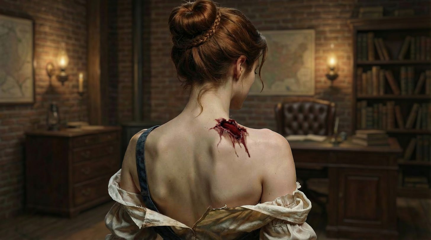 Dr. Merriweather came around to face me again, his eyes fixing on the injury itself rather than my state of undress. Some small part of me felt grateful for his professionalism even as I sat there in nothing but my bloodstained chemise and the loosened dress gathered at my waist.